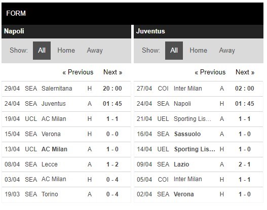 Thống kê phong độ Juventus vs Napoli