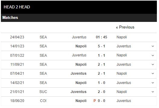 Thống kê đối đầu Juventus vs Napoli