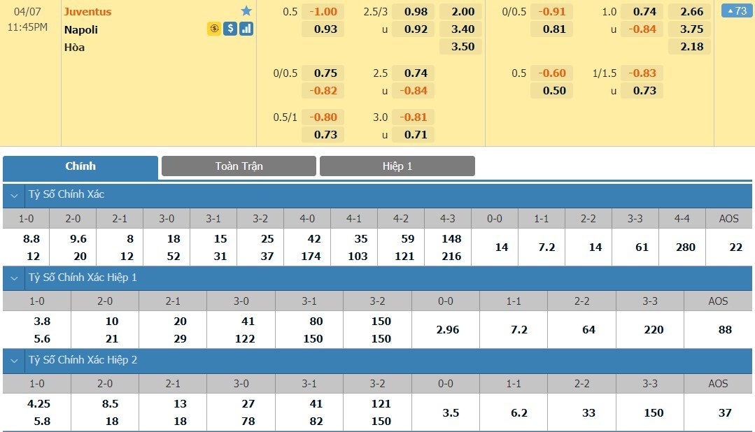 Tỷ lệ kèo cá cược bóng đá trực tuyến trận Juventus vs Napoli