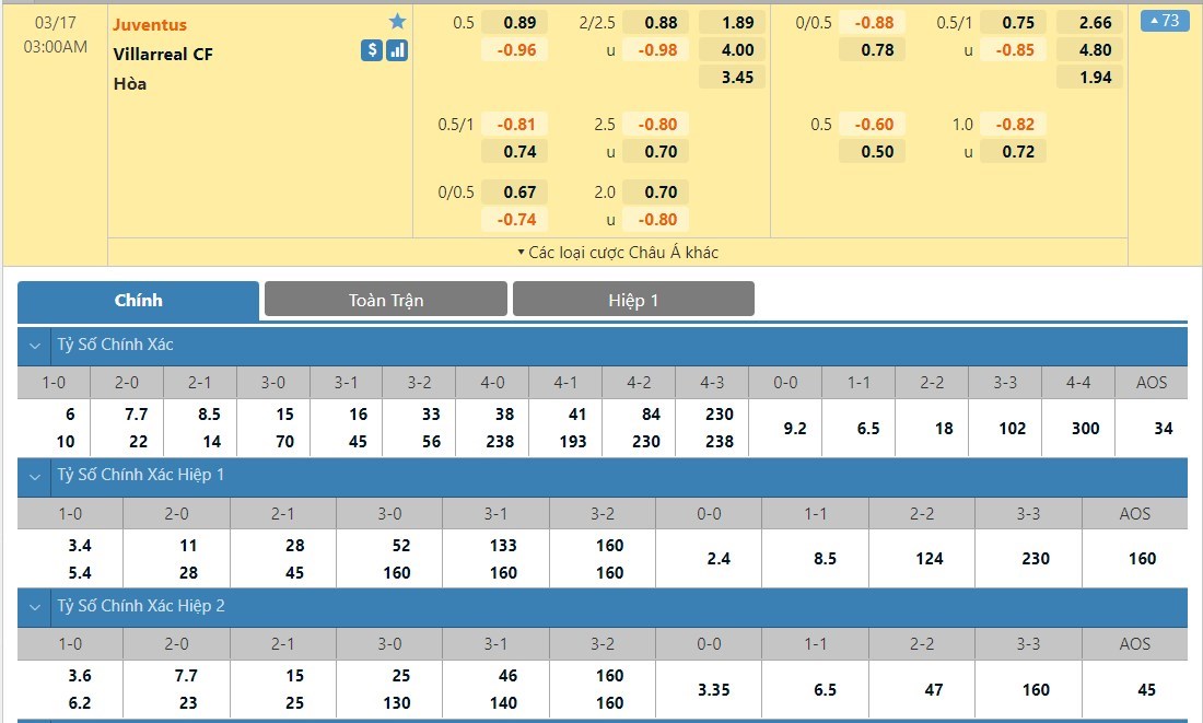 Tỷ lệ kèo cá cược bóng đá trực tuyến trận Juventus vs Villarreal