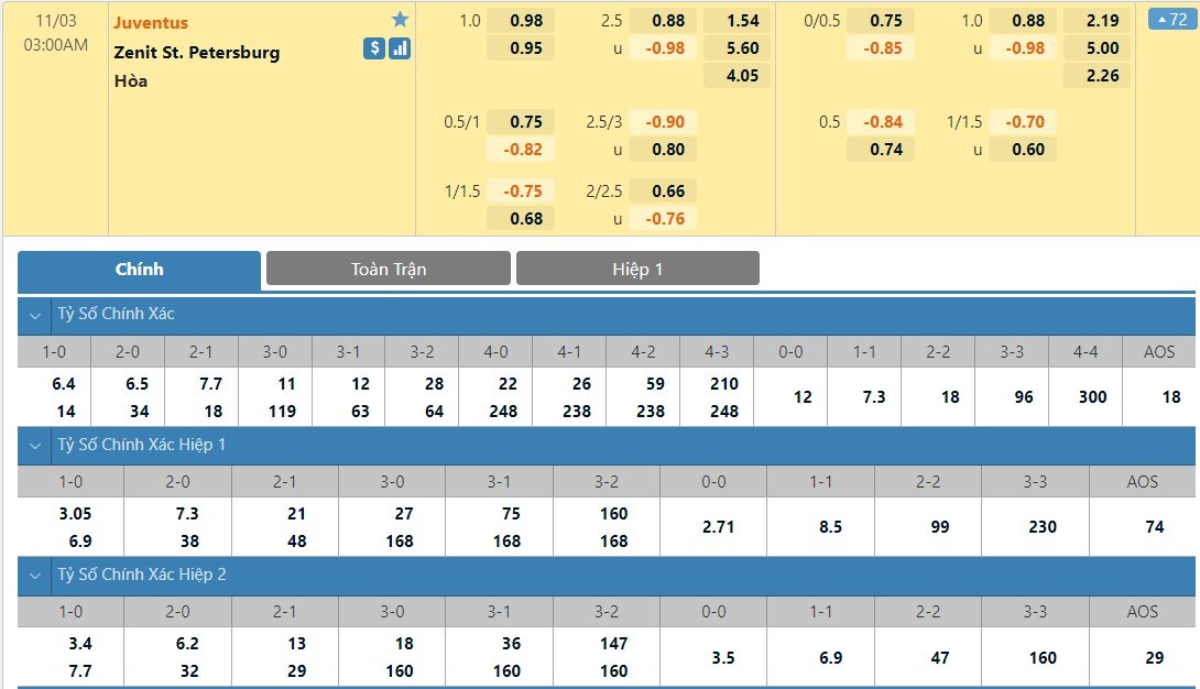 Tỷ lệ kèo cá cược bóng đá trực tuyến trận Juventus vs Zenit St. Petersburg