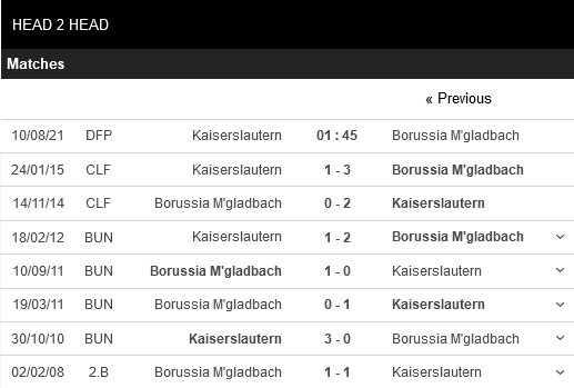 Thống kê đối đầu Kaiserslautern vs Borussia M.Gladbach