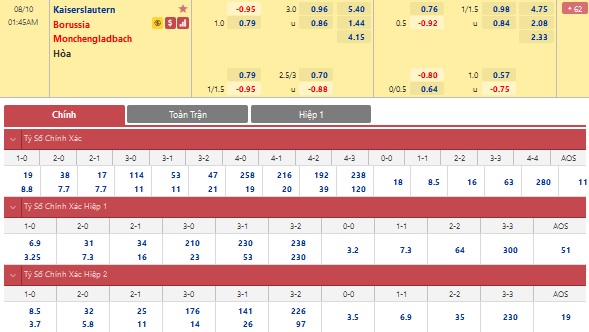 Kèo tài xỉu ban đầu 3 cho thấy xu hướng nổ tài có thể xuất hiện. Kaiserslautern có 3 trận hòa và 1 trận thắng trong 5 lần gần nhất có kèo tài xỉu 3 hòa. Bên phía Gladbach cũng có 2 trận thắng và 1 trận hòa. Điều đó cho thấy kèo tài 3 cũng tương đối an toàn.