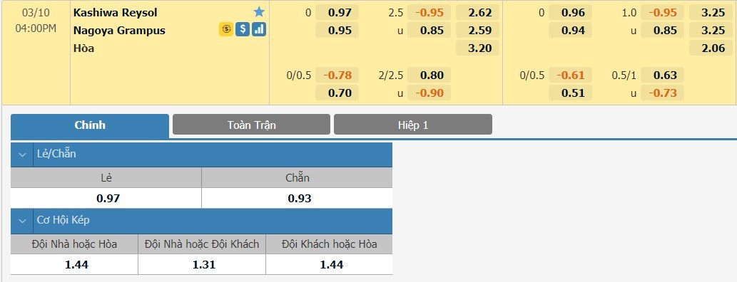 Tỷ lệ kèo cá cược bóng đá trận Kashiwa Reysol vs Nagoya Grampus