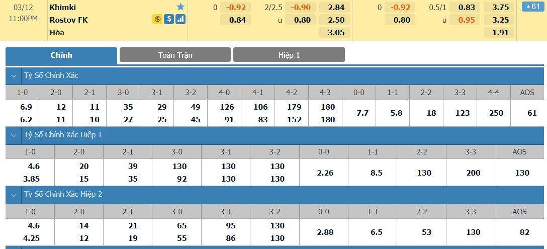 Tỷ lệ kèo cá cược bóng đá trận Khimki vs FC Rostov
