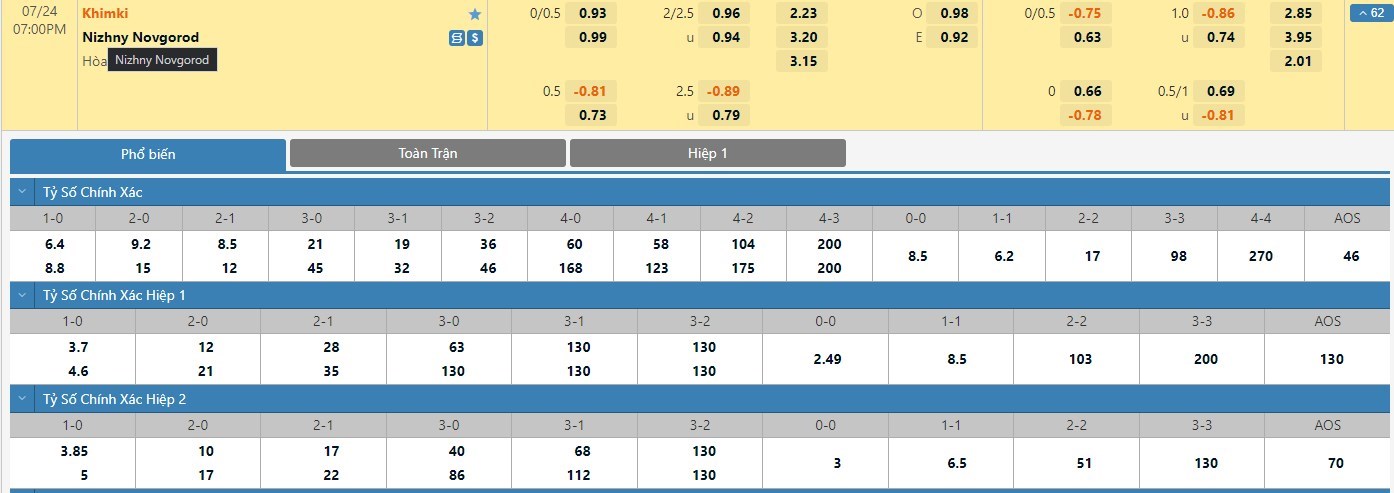 Tỷ lệ kèo cá cược bóng đá trực tuyến trận Khimki vs Nizhny Novgorod