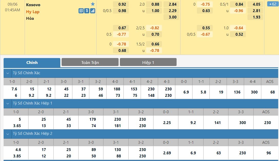 Tỷ lệ kèo cá cược bóng đá trận Kosovo vs Hy Lạp
