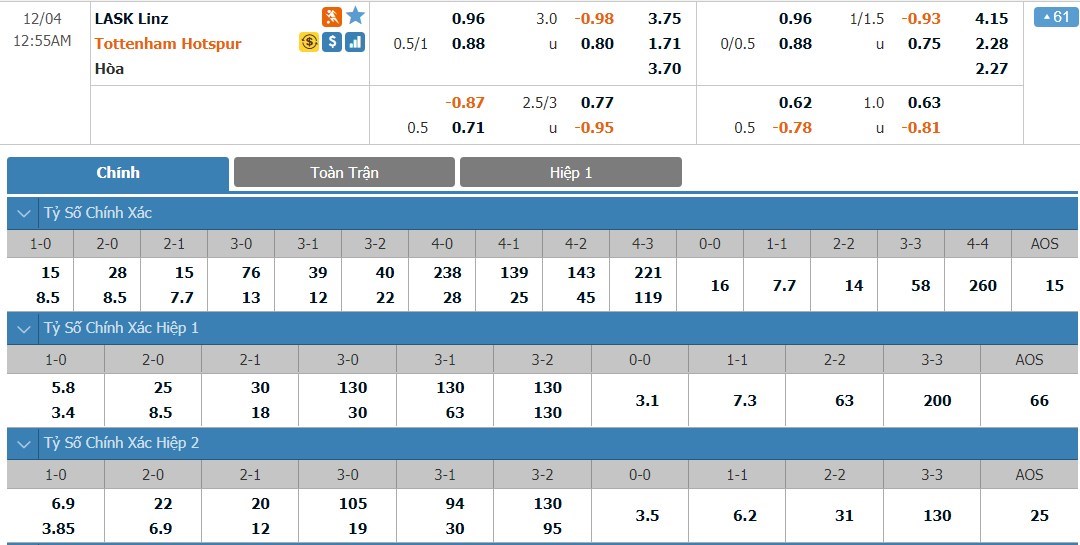Tỷ lệ kèo cá cược bóng đá trận LASK vs Tottenham
