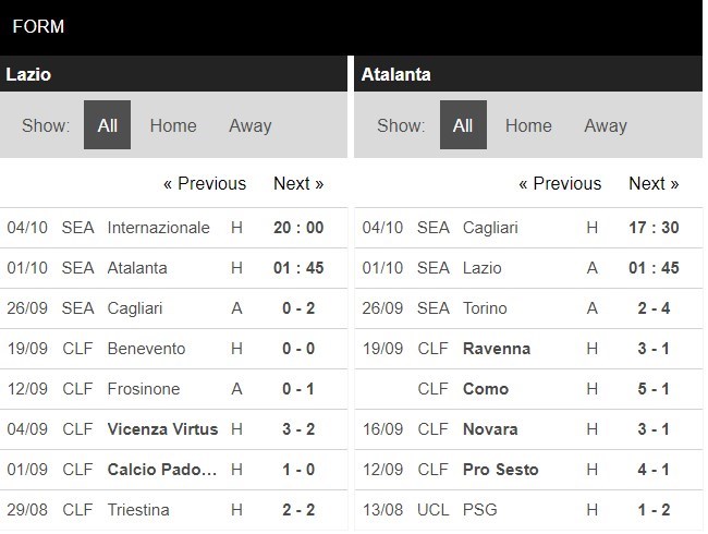 Xem tỷ lệ kèo cá cược bóng đá trực tuyến Lazio vs Atalanta