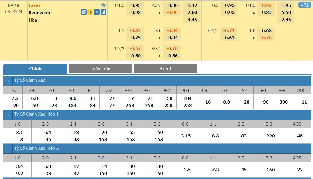 Tỷ lệ kèo cá cược bóng đá trận Lazio vs Benevento