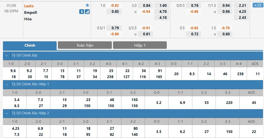 Tỷ lệ kèo cá cược bóng đá trực tuyến trận Lazio vs Empoli