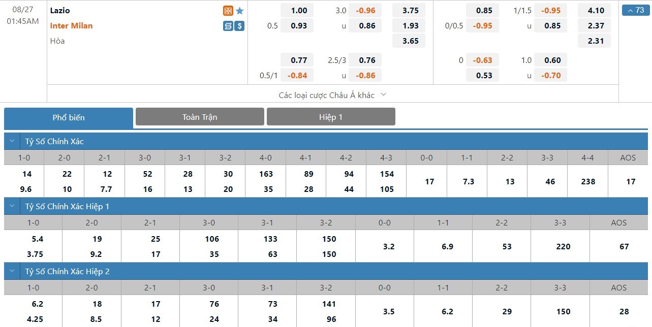 Xem tỷ lệ kèo cá cược bóng đá trực tuyến Lazio vs Inter Milan