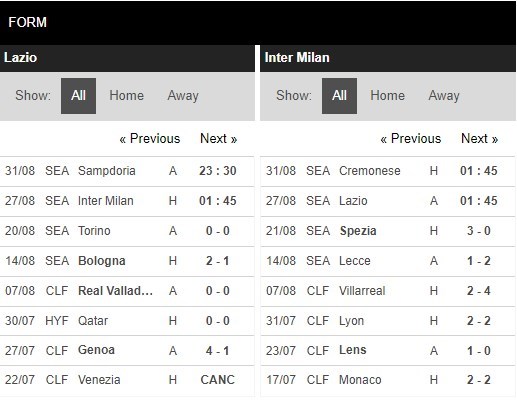 Thống kê phong độ Lazio vs Inter Milan
