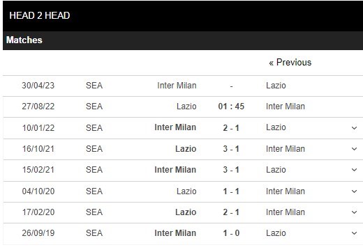 Thống kê đối đầu Lazio vs Inter Milan