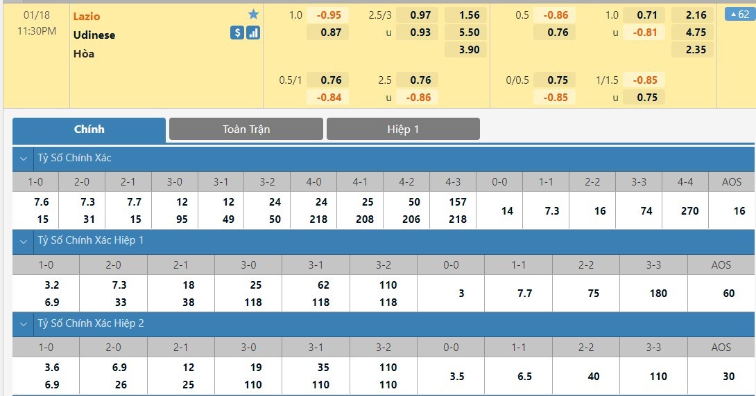 Tỷ lệ kèo cá cược bóng đá trực tuyến trận Lazio vs Udinese