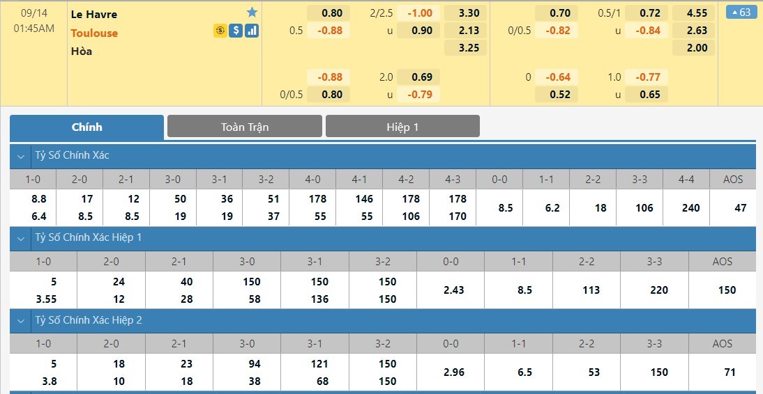 Tỷ lệ kèo cá cược bóng đá trận Le Havre vs Toulouse