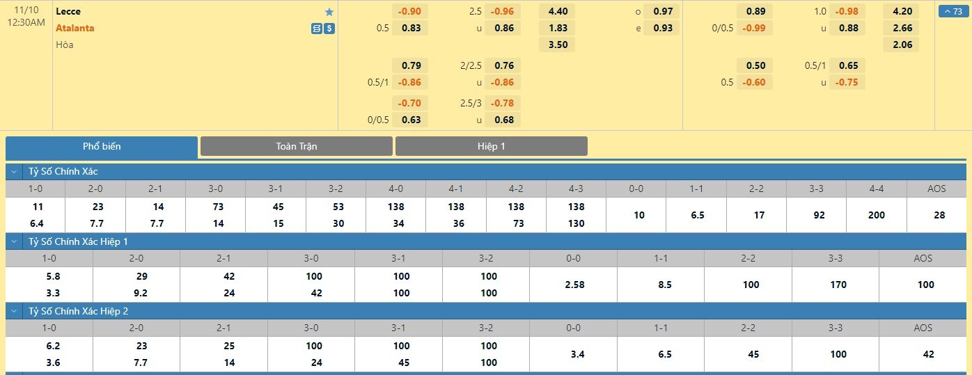 Tỷ lệ kèo cá cược bóng đá trận Lecce vs Atalanta