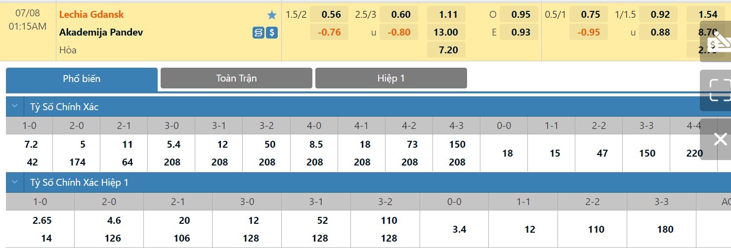 Xem tỷ lệ kèo cá cược bóng đá trực tuyến Lechia Gdansk vs Academy Pandev