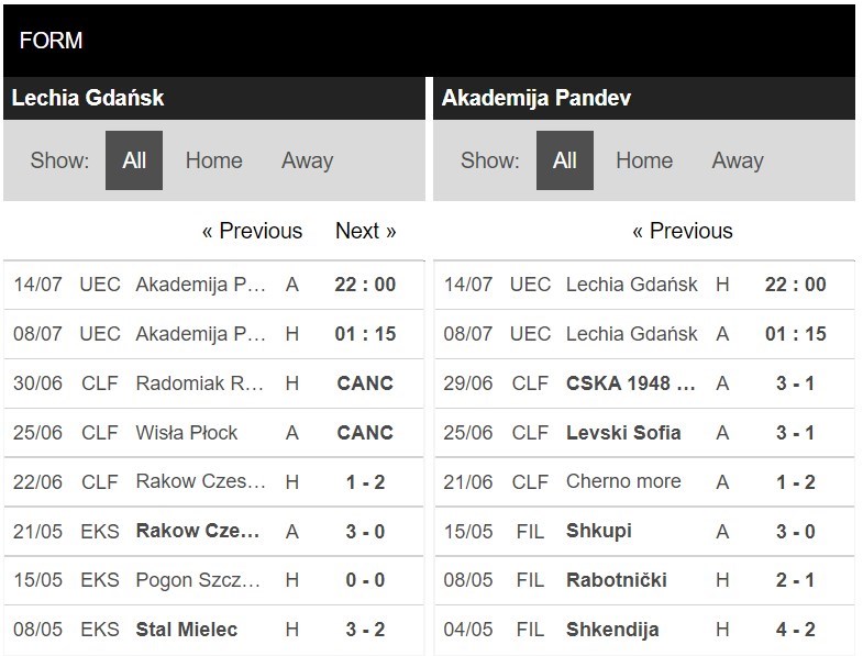 Thống kê phong độ Lechia Gdansk vs Academy Pandev