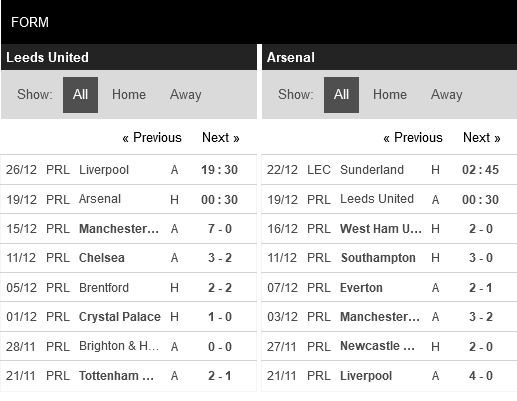 Thống kê phong độ Leeds United vs Arsenal