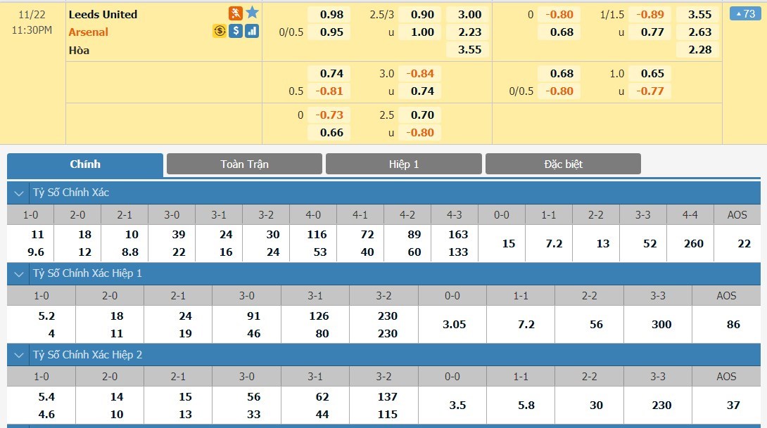 Tỷ lệ kèo cá cược bóng đá trực tuyến trận Leeds United vs Arsenal
