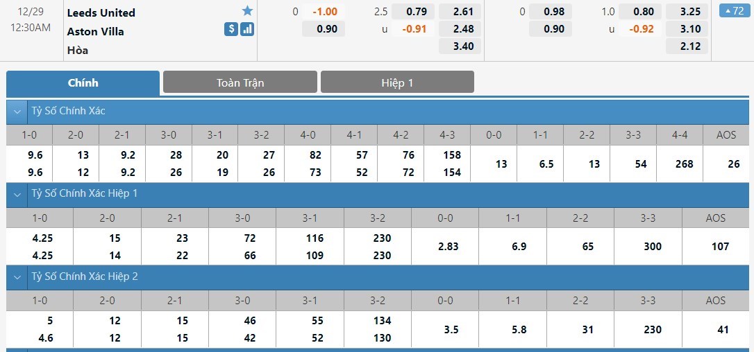 Tỷ lệ kèo cá cược bóng đá trực tuyến trận Leeds vs Aston Villa