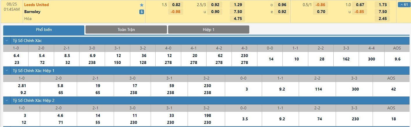 Tỷ lệ kèo cá cược bóng đá trận Leeds vs Barnsley