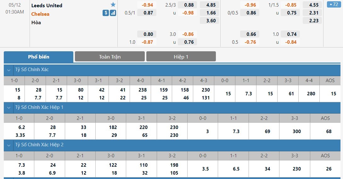 Tỷ lệ kèo cá cược bóng đá trực tuyến trận Leeds vs Chelsea