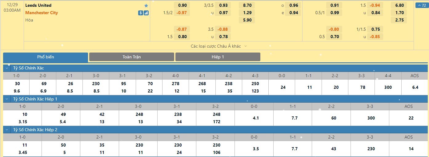 Xem tỷ lệ kèo cá cược bóng đá trực tuyến Leeds vs Manchester City