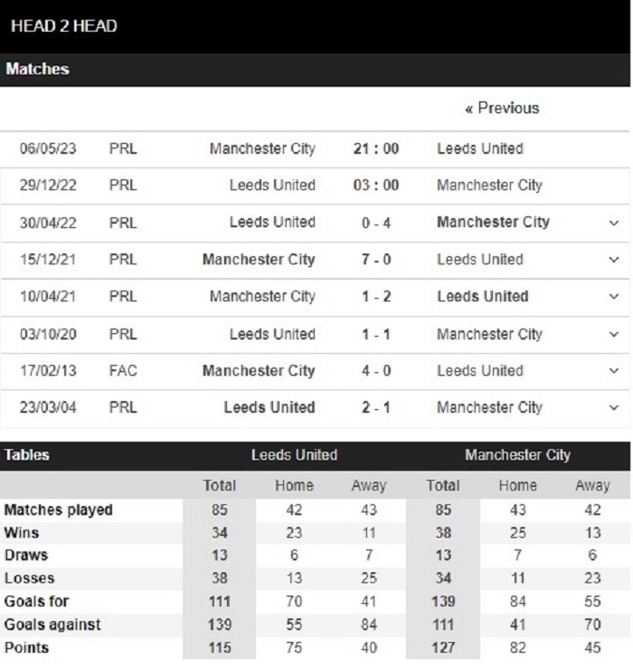 Thống kê đối đầu Leeds vs Manchester City