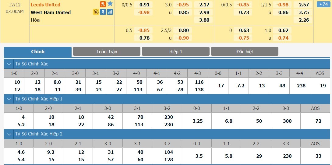 Xem tỷ lệ kèo cá cược bóng đá trực tuyến Leeds vs West Ham United