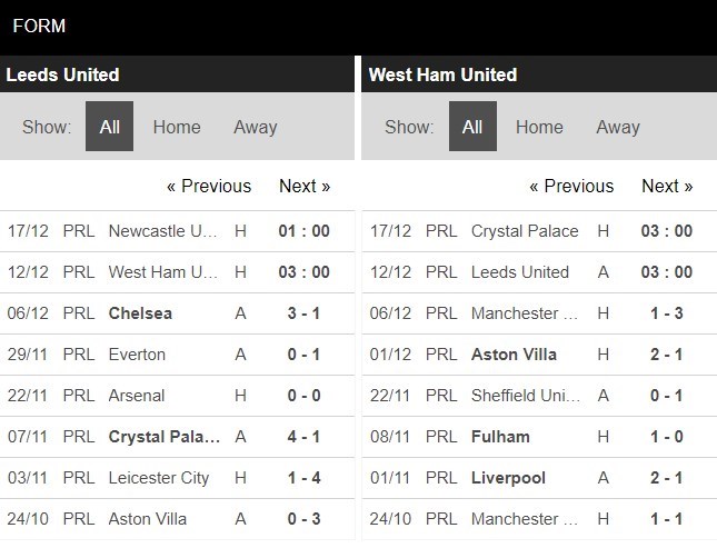 Thống kê phong độ Leeds vs West Ham United
