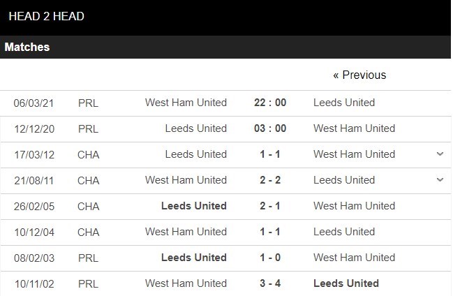 Thống kê đối đầu Leeds vs West Ham United