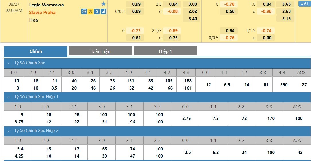 Tỷ lệ kèo cá cược bóng đá trận Legia Warszawa vs Slavia Praha