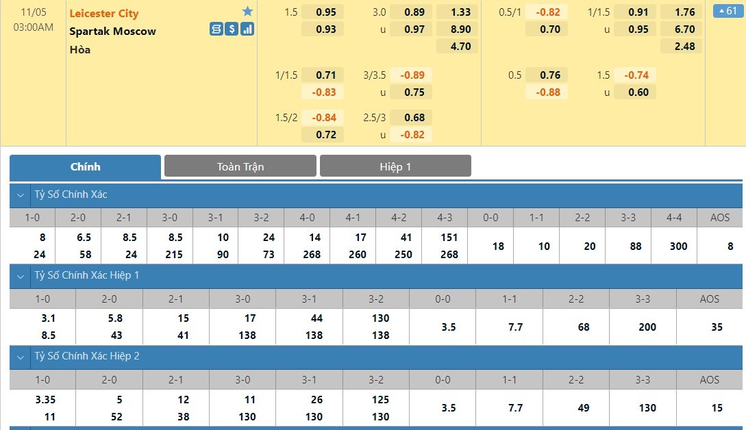 Tỷ lệ kèo cá cược bóng đá trực tuyến trận Leicester City vs Spartak Moscow