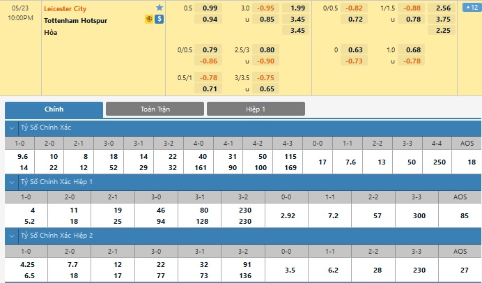 Xem tỉ lệ kèo cá cược bóng đá trực tuyến Leicester City vs Tottenham