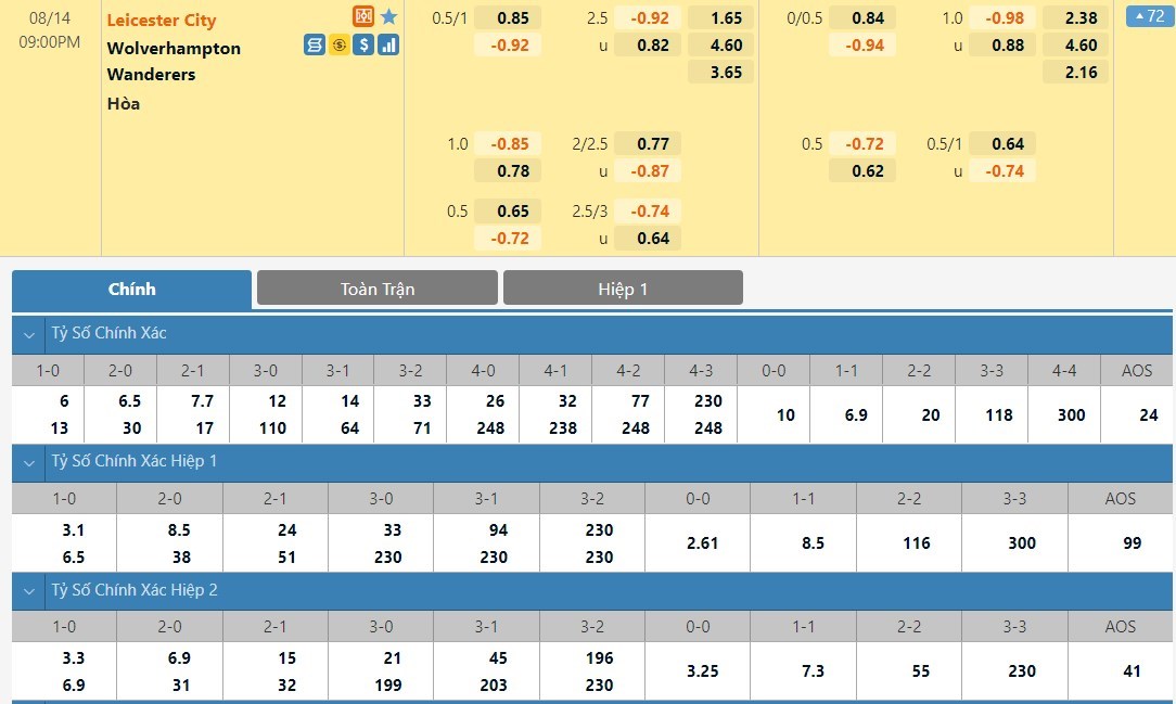 Tỷ lệ kèo cá cược bóng đá trận Leicester City vs Wolverhampton