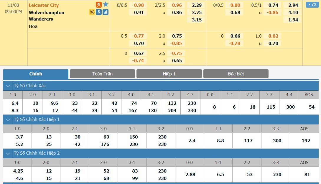 Xem tỷ lệ kèo cá cược bóng đá trực tuyến Leicester City vs Wolves