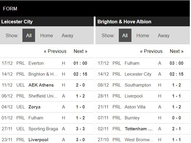 Vòng 12 của giải Ngoại hạng Anh năm nay sẽ chính thức khép lại với màn đụng độ giữa Leicester và đội khách Brighton. Leicester với 2 bàn thắng sớm của Under và Barnes đã nhẹ nhàng đả bại AEK Athens FC 2 bàn không gỡ ở lượt trận cuối vòng bảng Europa League năm nay. 3 điểm có được giúp cho The Fox chính thức cán đích ở ngôi đầu bảng G với 13 điểm sau 6 lượt trận, đội bóng này cùng có điểm như Braga nhưng lại hơn về chỉ số phụ. Còn tại giải Ngoại hạng Anh, Bầy cáo đang nằm trong top 4 đội dẫn đầu. Họ có 21 điểm sau 11 lượt trận. Thành tích cụ thể của đội chủ sân King Power là thắng 7, thua 4.
