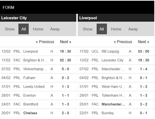 Thống kê phong độ Leicester vs Liverpool