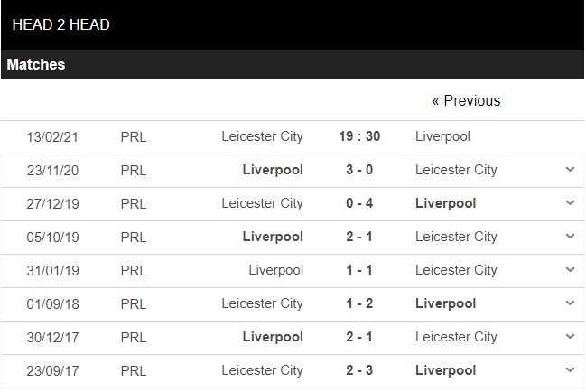 Thống kê đối đầu Leicester vs Liverpool