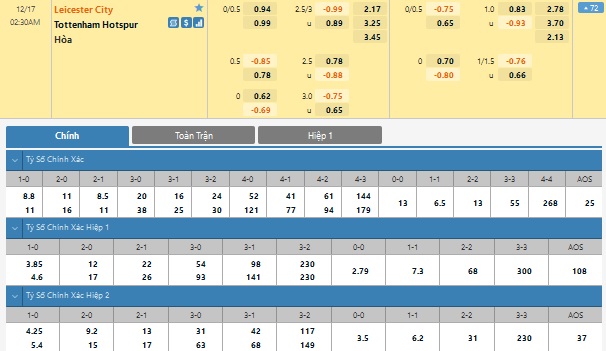 Xem tỉ lệ kèo cá cược bóng đá trực tuyến Leicester vs Tottenham