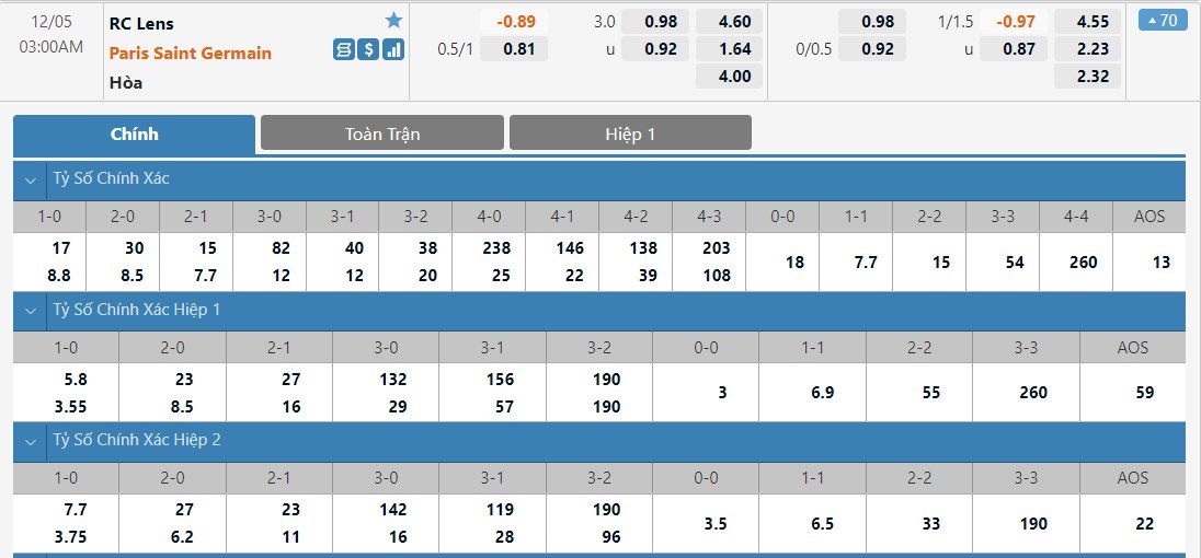 Tỷ lệ kèo cá cược bóng đá trực tuyến trận Lens vs Paris Saint-Germain