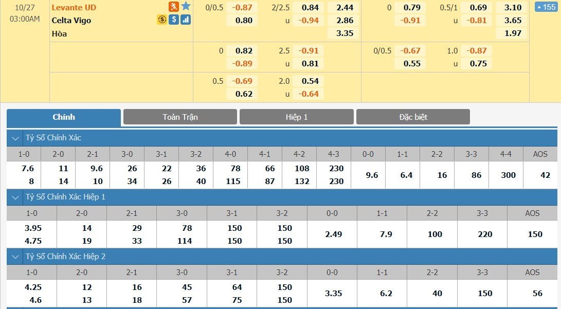 Xem tỷ lệ kèo cá cược bóng đá trực tuyến Levante vs Celta Vigo
