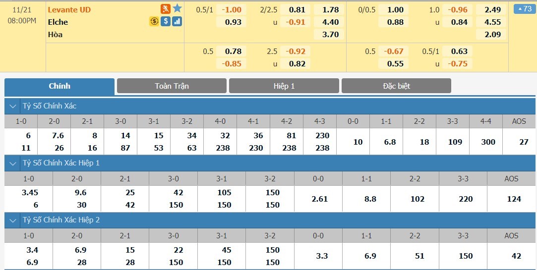 Tỷ lệ kèo cá cược bóng đá trực tuyến trận Levante vs Elche CF