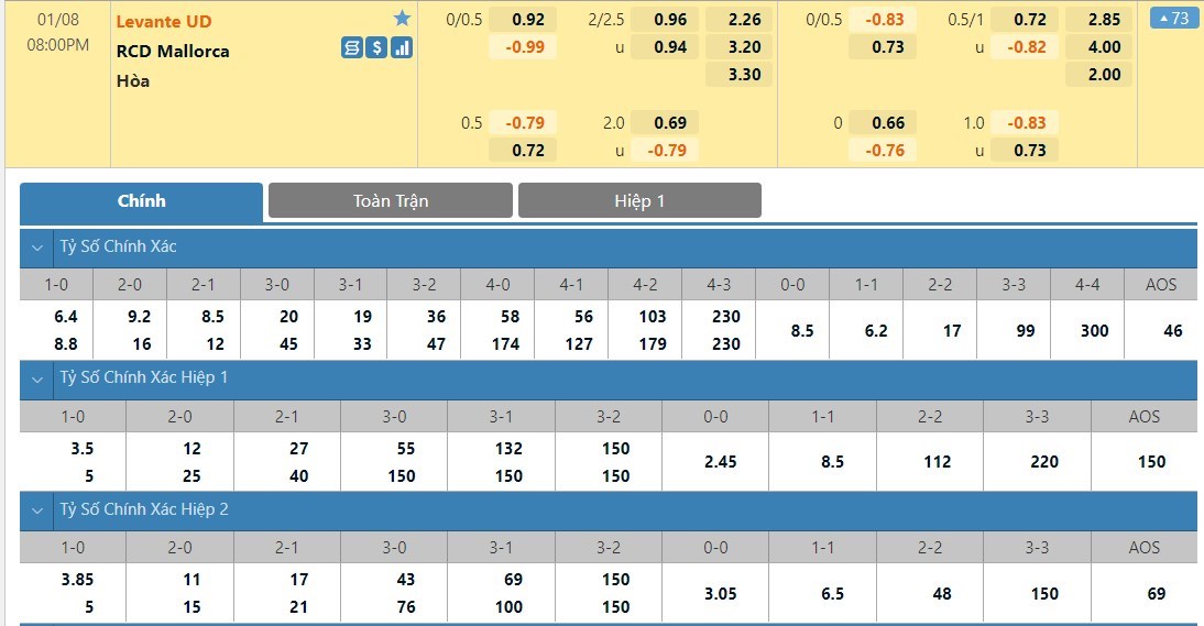 Tỷ lệ kèo cá cược bóng đá trực tuyến trận Levante vs Mallorca