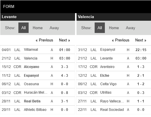 Thống kê phong độ Levante vs Valencia