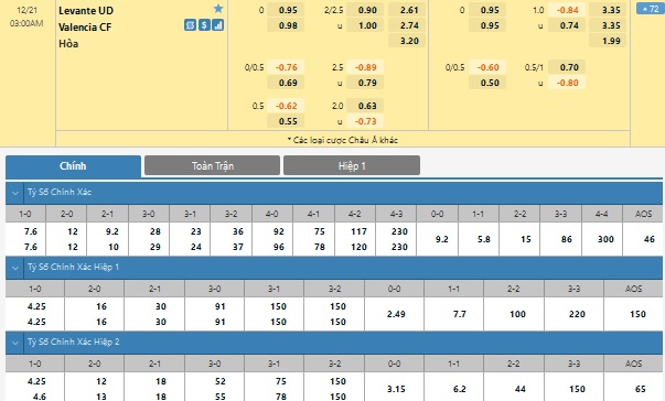 Xem tỉ lệ kèo cá cược bóng đá trực tuyến Levante vs Valencia