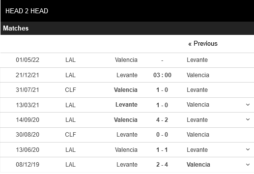 Thống kê đối đầu Levante vs Valencia