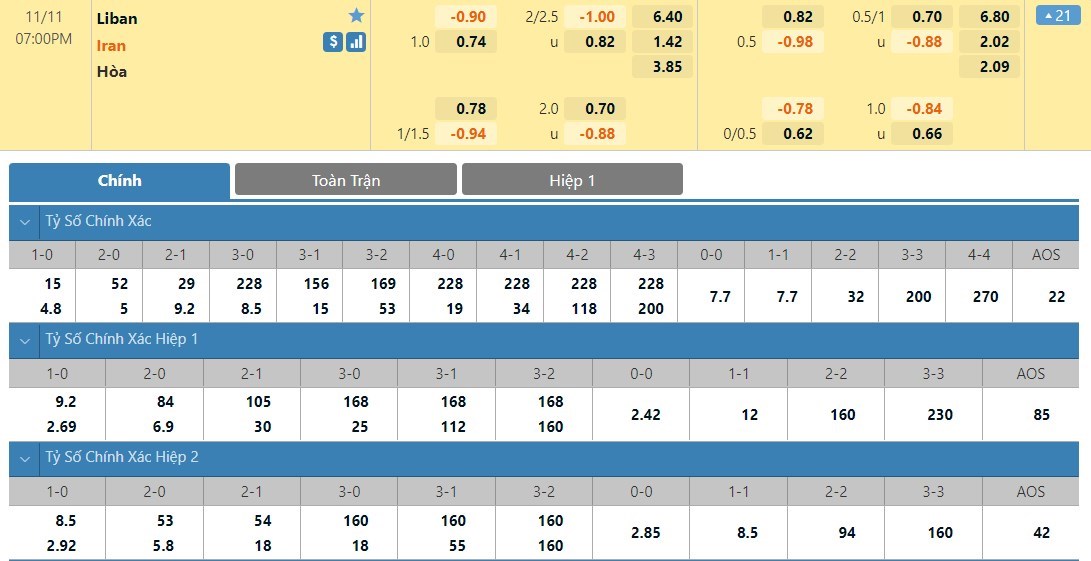 Tỷ lệ kèo cá cược bóng đá trực tuyến trận Liban vs Iran